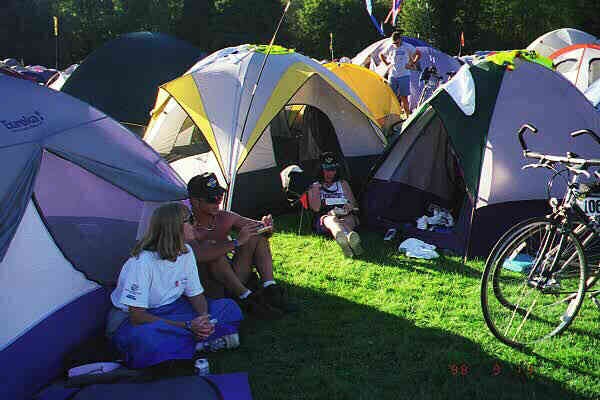All the mechanics knew Janet on a first name basis. The mechanics were awesome - they never rushed and meticulous. Thanks to Jerry at Primo for talking me into that new 105 triple - I needed it to get up the hills (mountains to us). Although, by the end of the ride I was getting mad if anyone made me use my breaks on a downhill - one rider called me "Peek-a-Boo" in reference to the downhill skier. I was hitting 40-45 mph down those switchbacks - Yeehaw! On the ride back to Diamond Lake from Crater Lake (a long downhill run) an ambulance saw Burt and I wizzing by with our GCC jerseys and decided to follow us flatlanders down the mountain. I guess he was sure we'd hit a cross wind and be road kill; we fortunately disappointed them. On the bus ride back to Portland one tandem team said they hit 51 mph! That is faith.